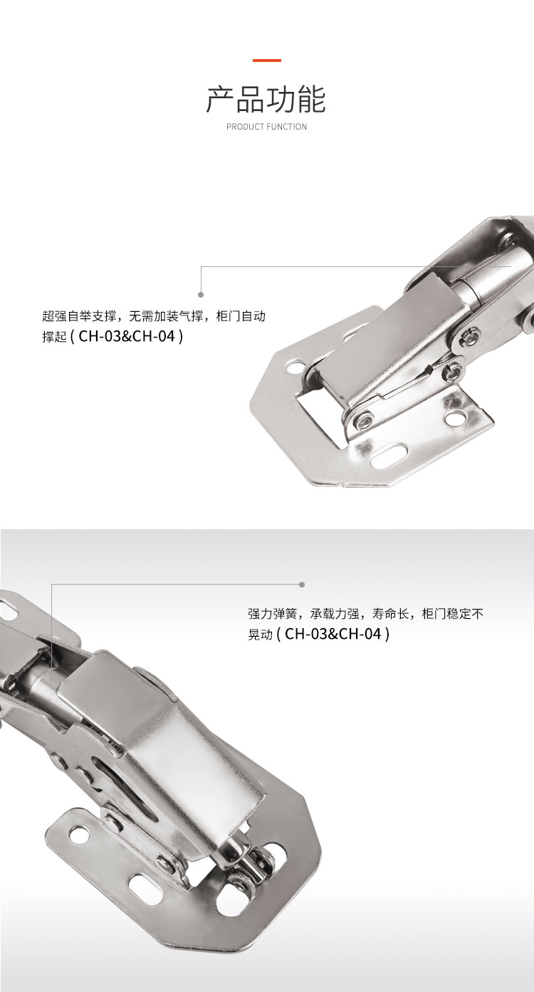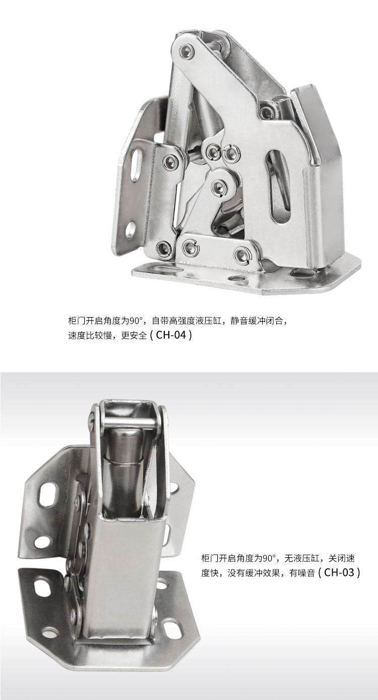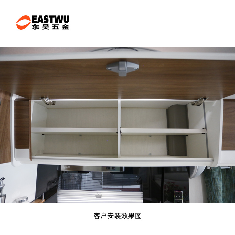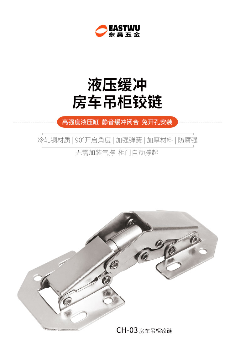 冷軋鋼房車吊柜緩沖鉸鏈 靜音緩沖 免開孔 無(wú)需加裝氣撐 柜門自動(dòng)撐起 適用門厚8-20mm 開啟角度90° 使用范圍房車吊柜、衣柜等