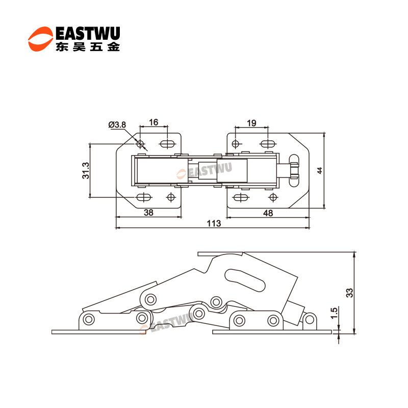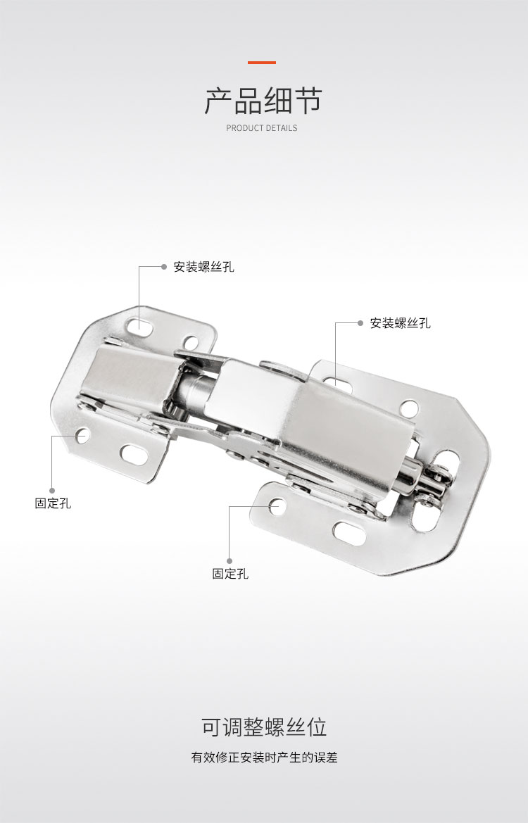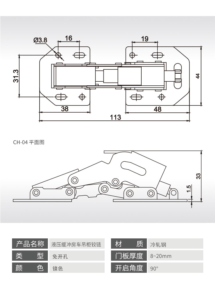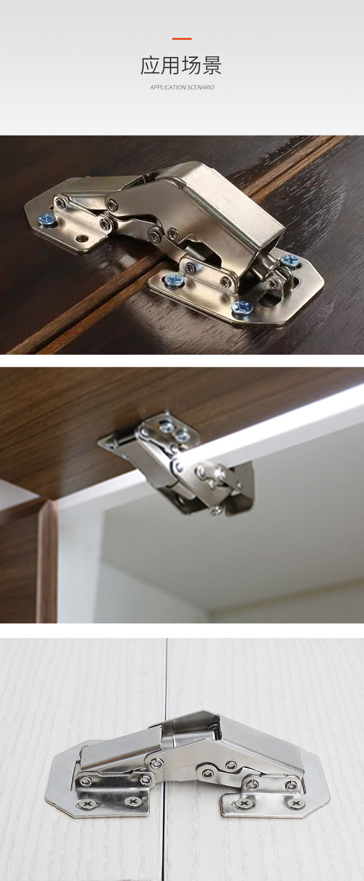 冷軋鋼房車吊柜緩沖鉸鏈 靜音緩沖 免開孔 無(wú)需加裝氣撐 柜門自動(dòng)撐起 適用門厚8-20mm 開啟角度90° 使用范圍房車吊柜、衣柜等