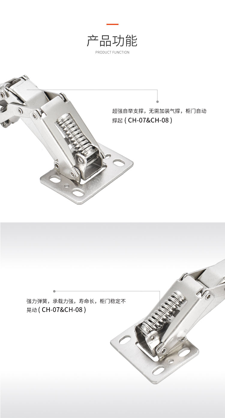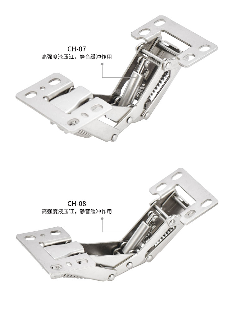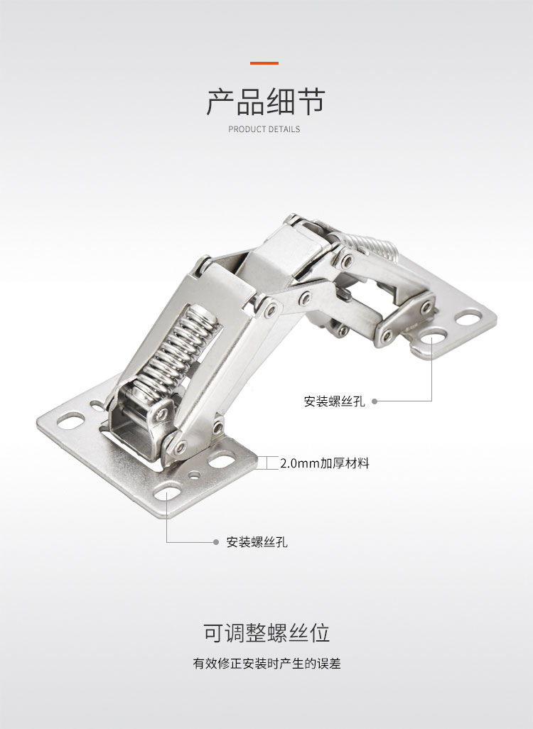 冷軋鋼房車吊柜緩沖鉸鏈 靜音緩沖 免開孔 無需加裝氣撐 柜門自動撐起 適用門厚15-18mm 開啟角度90° 使用范圍房車吊柜、衣柜等
