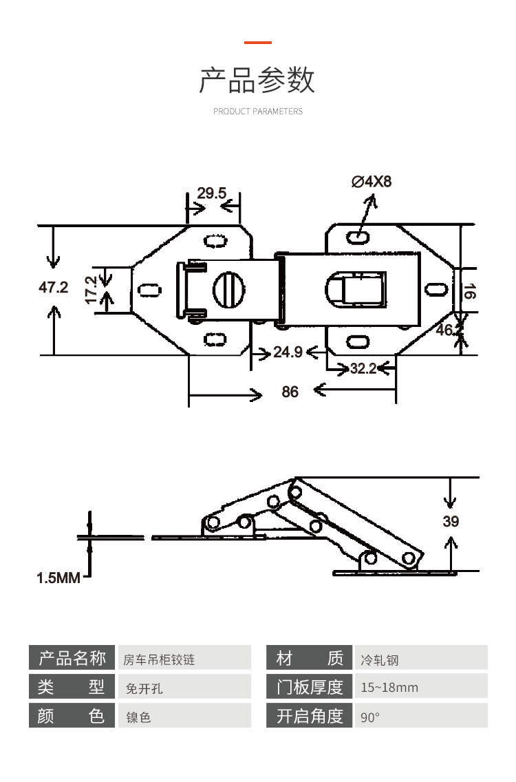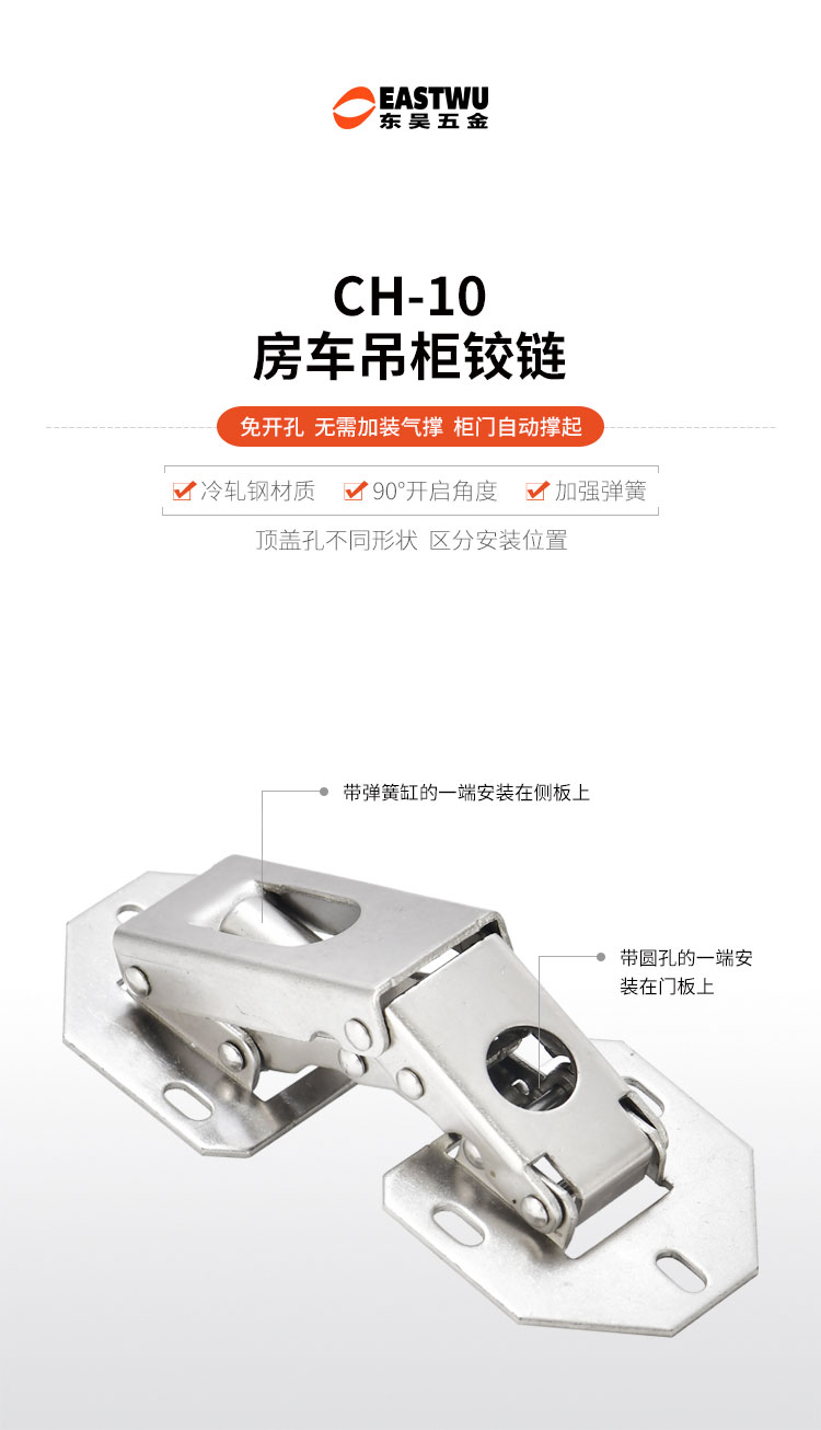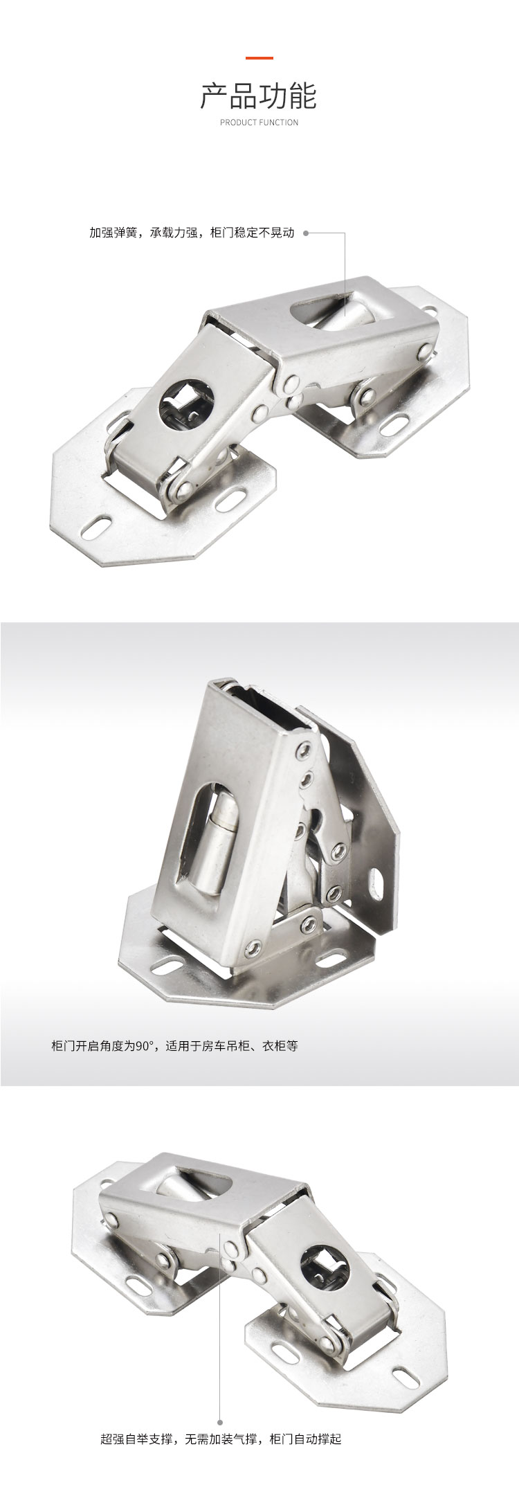 冷軋鋼房車吊柜鉸鏈 免開孔 無需加裝氣撐 柜門自動撐起 適用門厚15-18mm 開啟角度90° 使用范圍房車吊柜、衣柜等