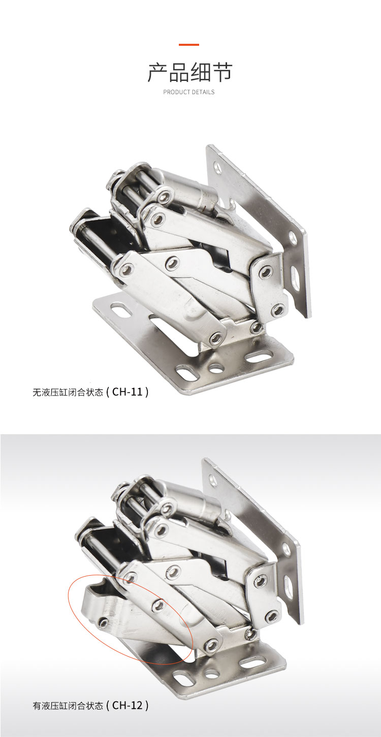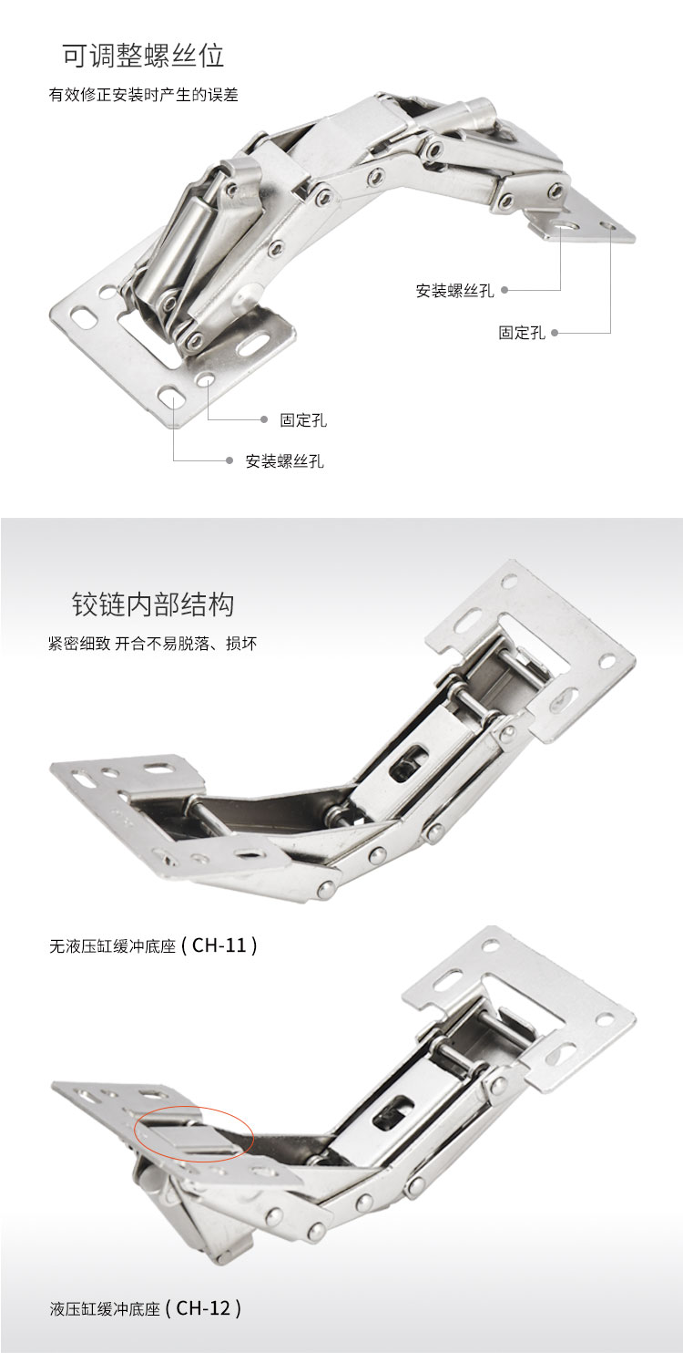 冷軋鋼房車吊柜鉸鏈 免開(kāi)孔 無(wú)需加裝氣撐 柜門自動(dòng)撐起 適用門厚15-18mm 開(kāi)啟角度150° 使用范圍房車吊柜、衣柜等
