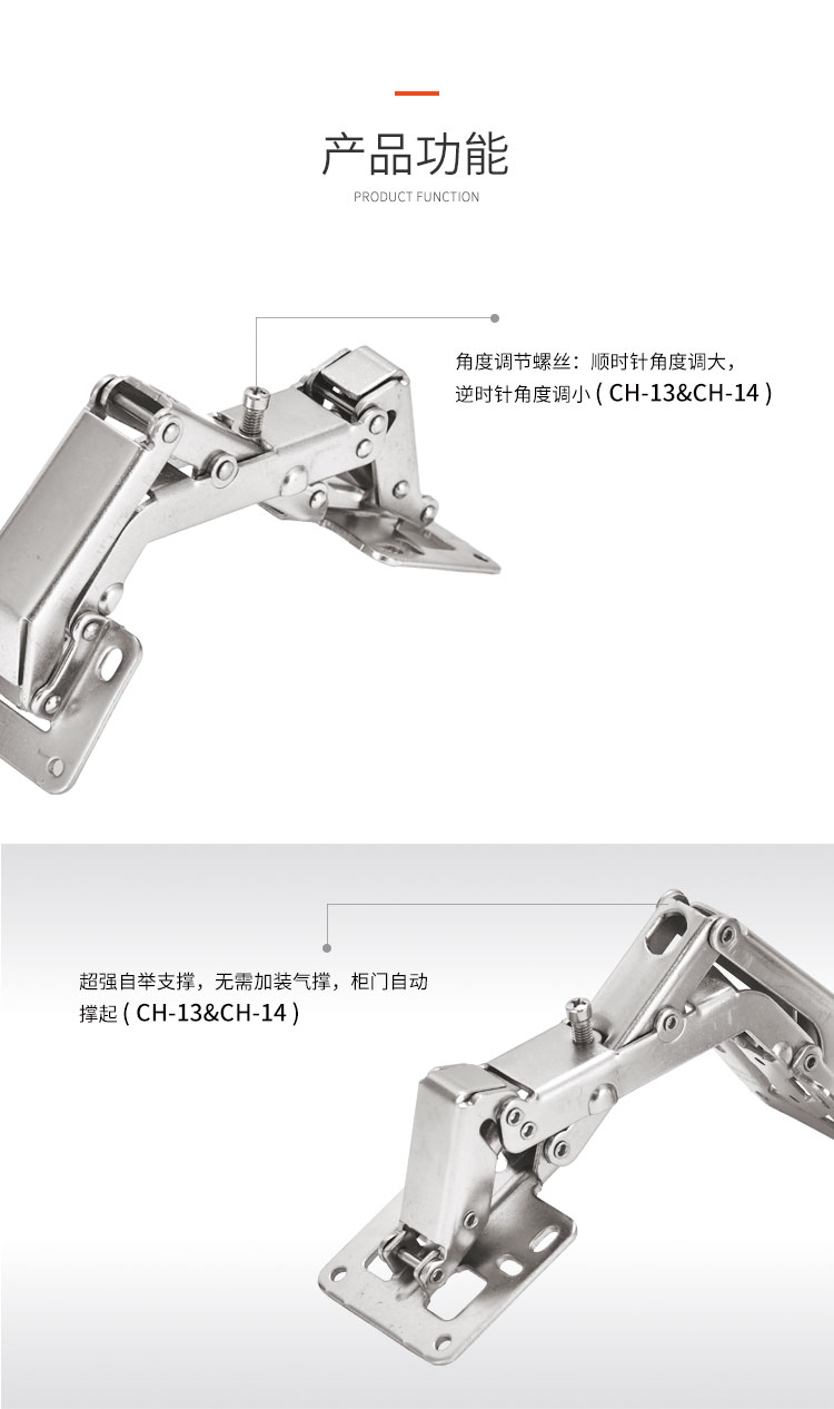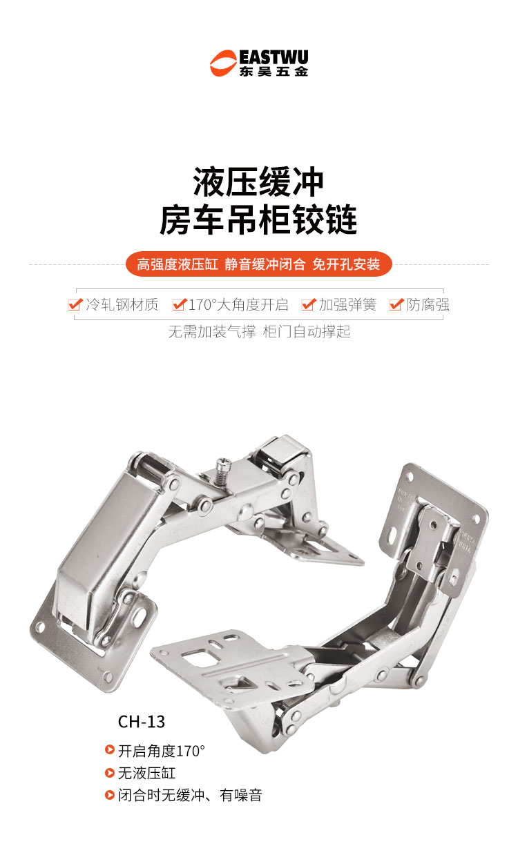 冷軋鋼房車吊柜鉸鏈 免開孔 無需加裝氣撐 柜門自動撐起 適用門厚15-40mm 開啟角度170° 使用范圍房車吊柜、衣柜等