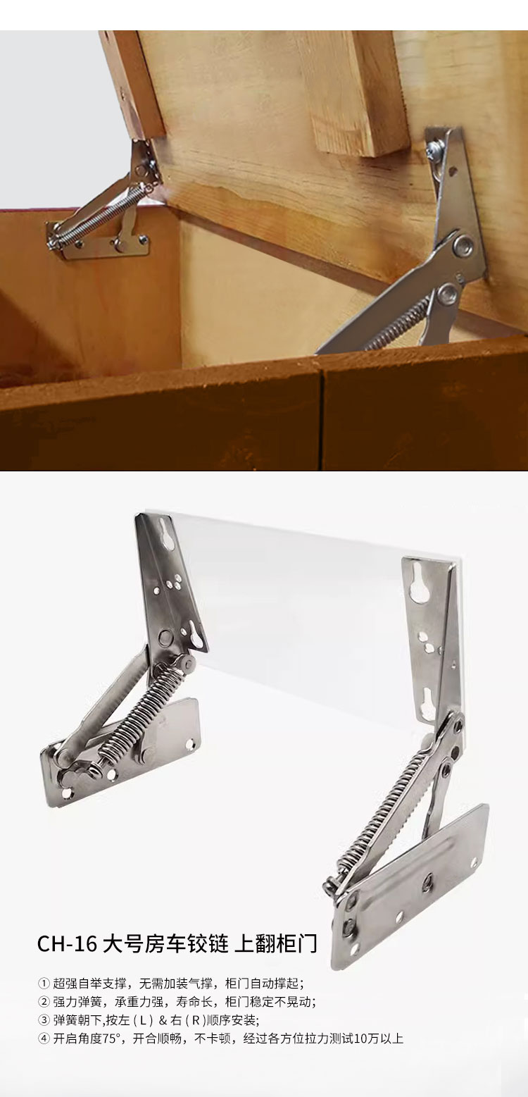冷軋鋼房車吊柜鉸鏈 免開孔 無(wú)需加裝氣撐 柜門自動(dòng)撐起 適用門厚15-18mm 開啟角度75° 使用范圍房車吊柜、衣柜等