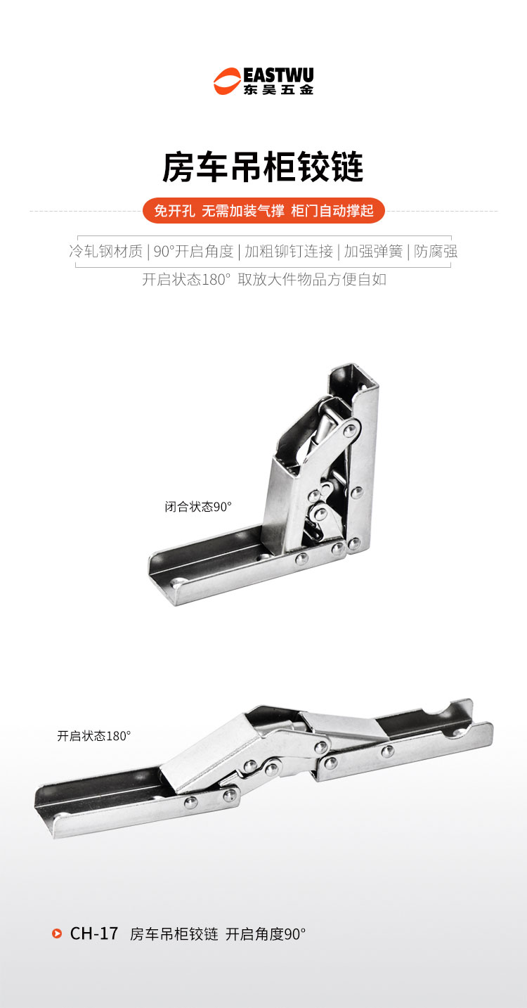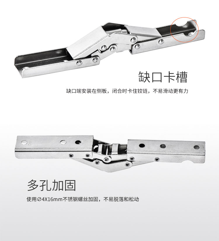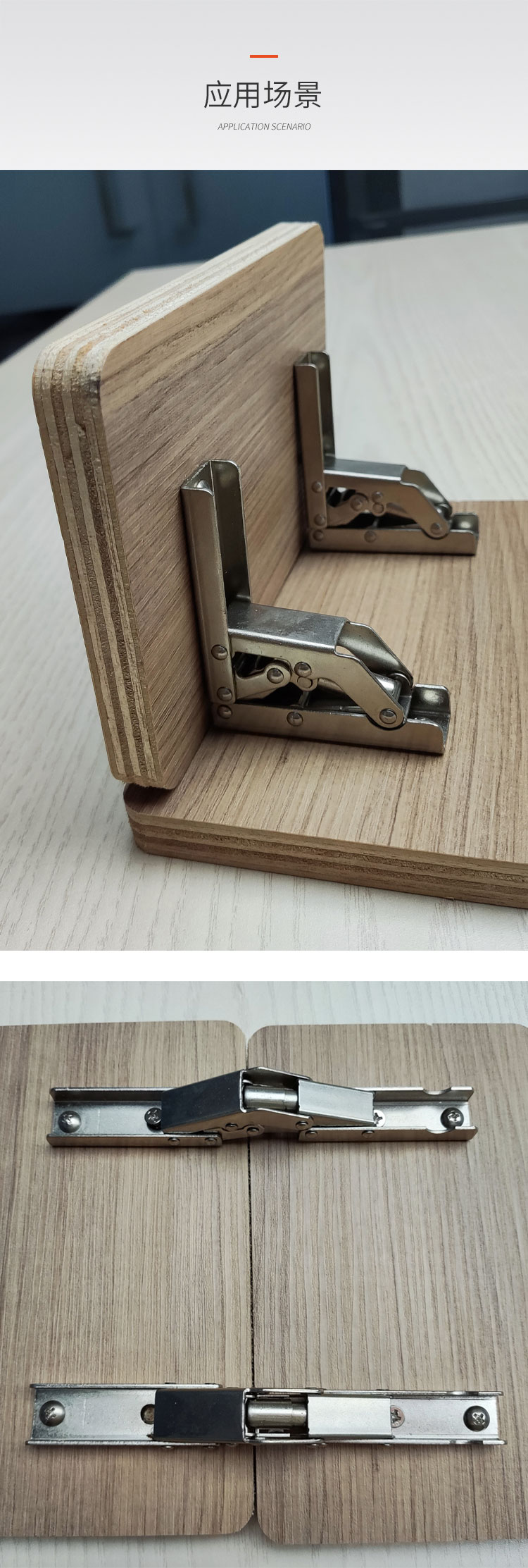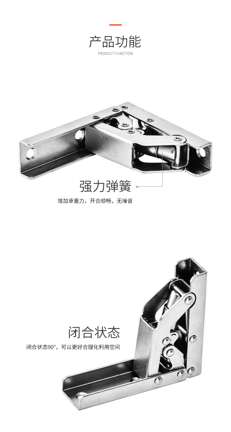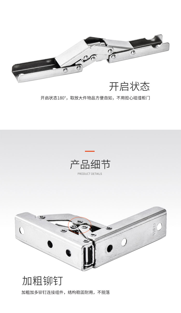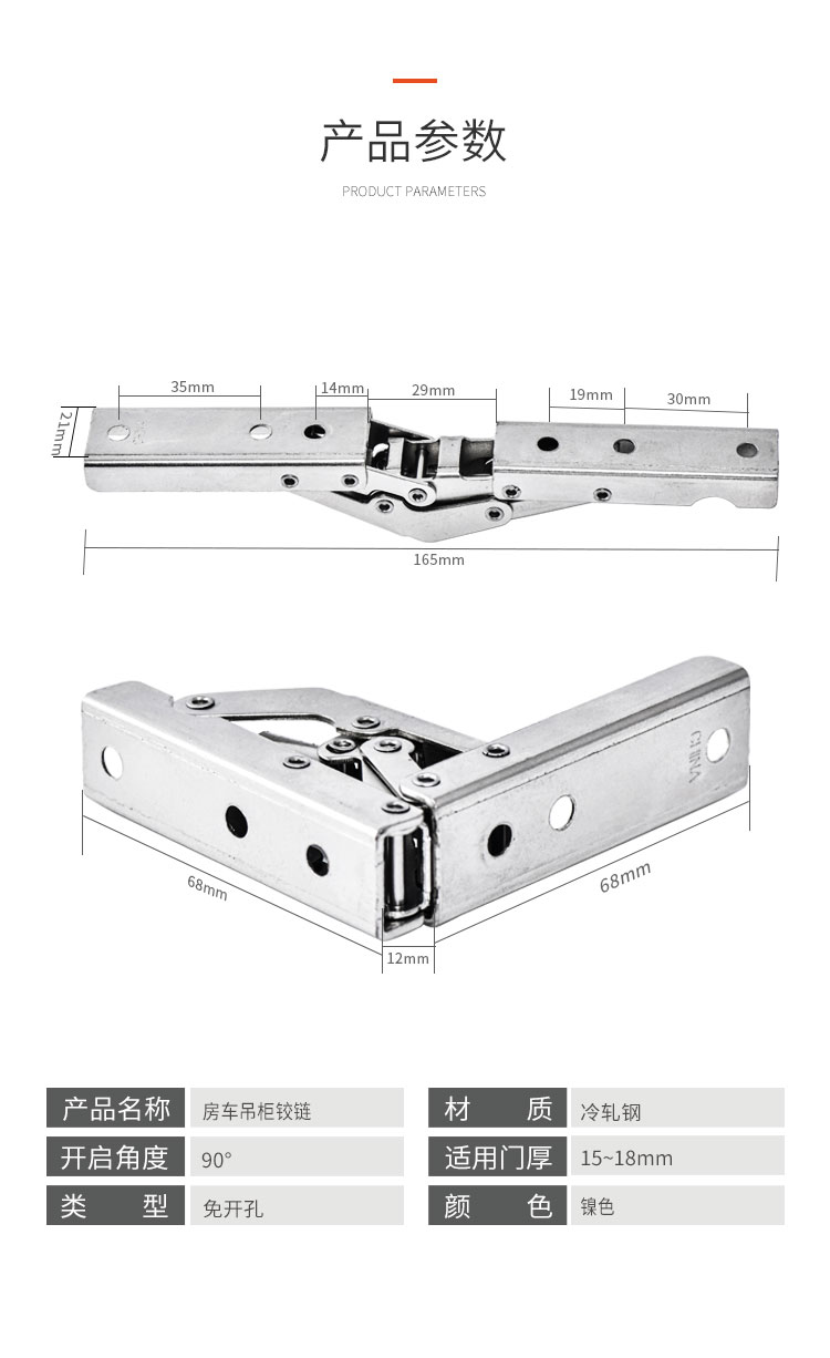 冷軋鋼材質(zhì),免開孔安裝,自舉支撐,鎳色鉸鏈,適合門厚15-18mm開啟角度90°,更好的利用安裝空間