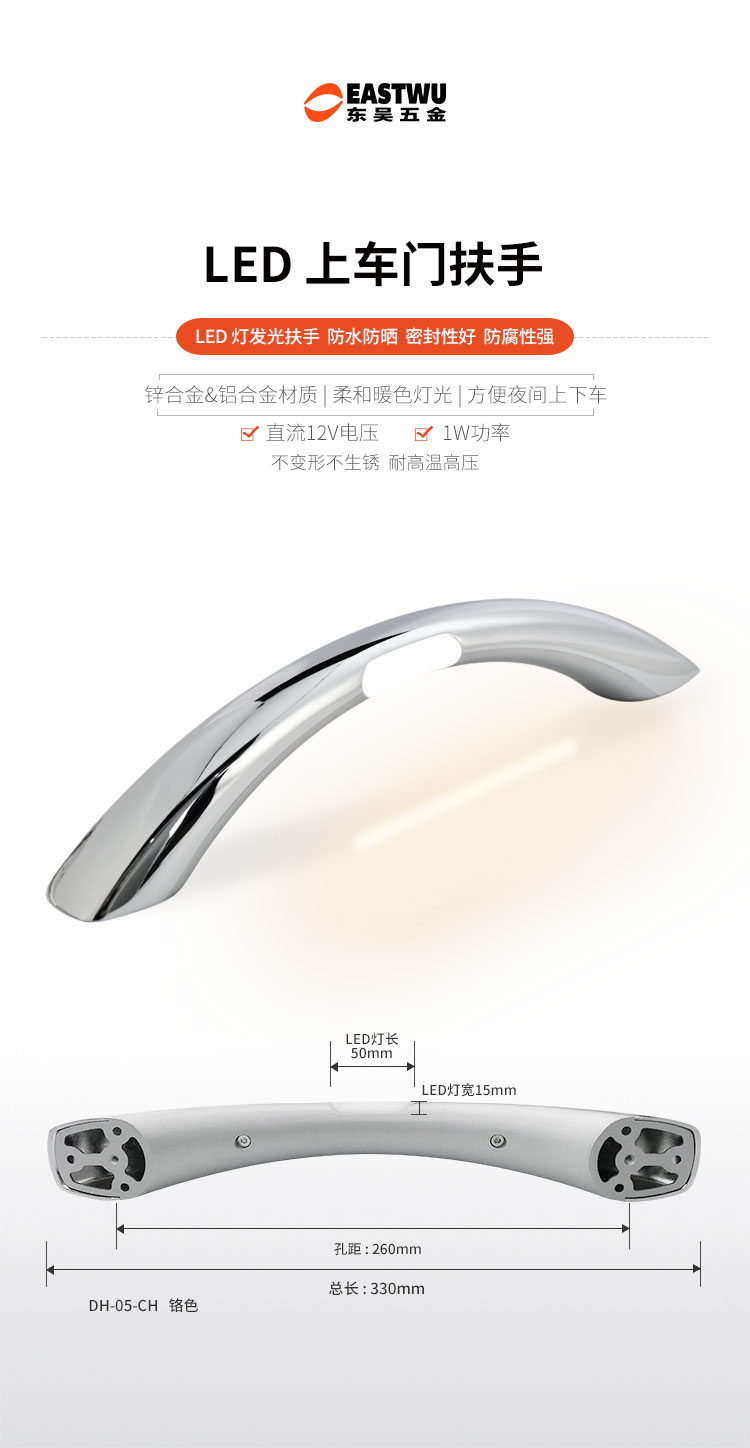 鋅合金&鋁合金LED上車門扶手 功率1W 電壓12V 工作溫度20-45℃ 防水等級IP20 上下分體式結(jié)構(gòu),可以從家具正面或背面安裝