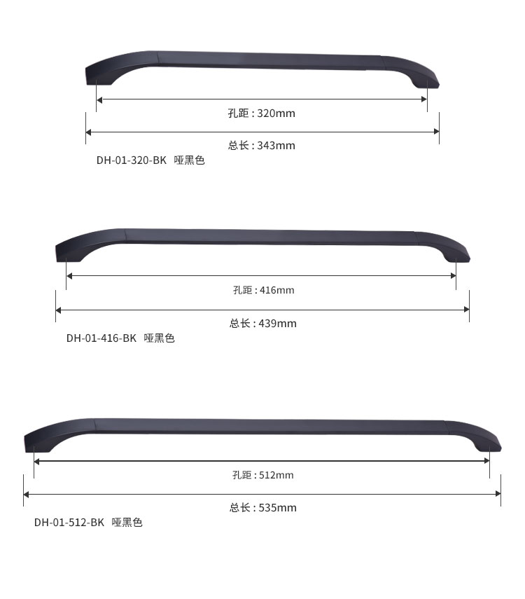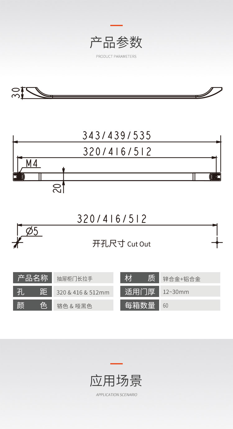 ·適用于房車、旅居車、救護車、改裝車、櫥柜、抽屜簡約百搭 ·材質(zhì):鋅合金&鋁合金 門板厚度:12-30mm 孔距:512/416/320mm