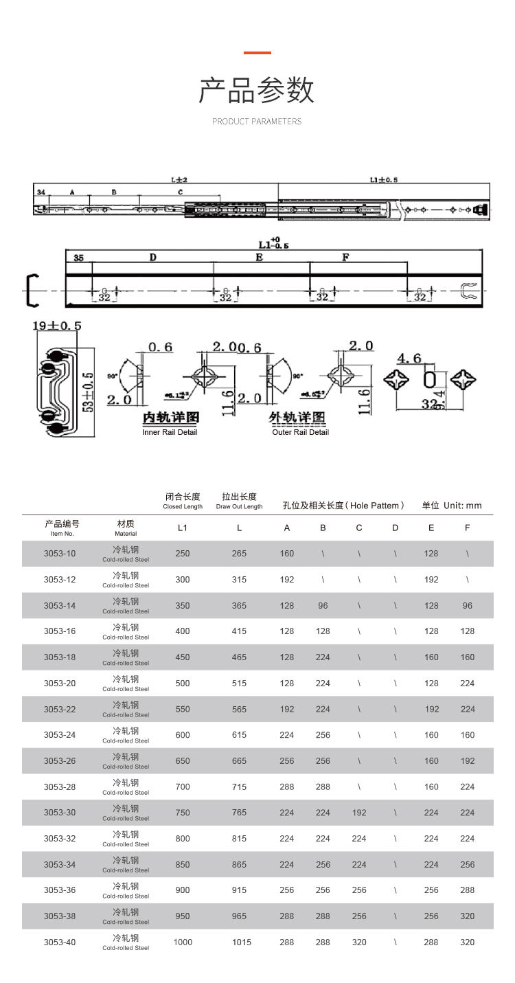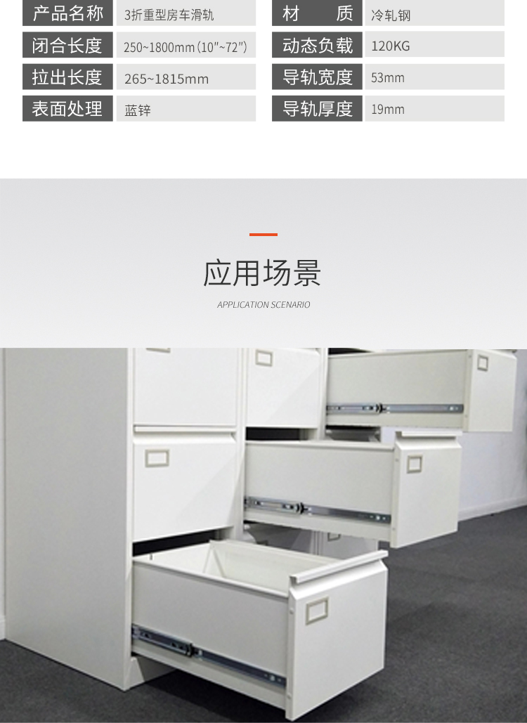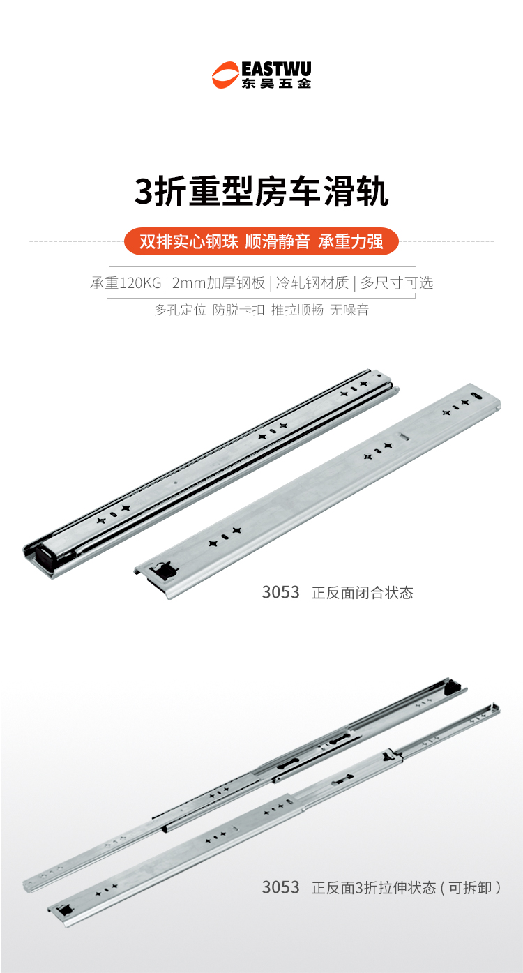 ·適用房車櫥柜、工業(yè)抽屜 安裝在抽屜側(cè)面 承重:120KG 長度:250-1800mm 導(dǎo)軌寬度:53mm 導(dǎo)軌厚度:19mm 材料厚度:2.0mm 使用范圍:房車櫥柜、工業(yè)抽屜等
